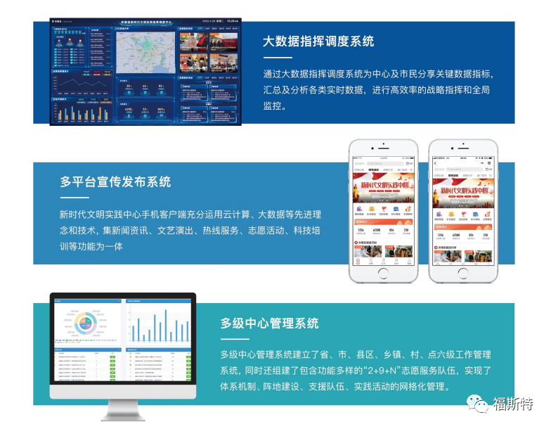 安徽福斯特信息技術有限公司持續(xù)助力新時代文明實踐中心建設,充分利用大數(shù)據(jù)、云計算、移動互聯(lián)網(wǎng)等新一代信息技術,打造新時代文明實踐中心云平臺,完善平臺動員、整合、引導、服務、創(chuàng)新和保障能力,實現(xiàn)新時代文明實踐中心的可持續(xù)運營。 福斯特新時代文明實踐中心云平臺集服務、管理、發(fā)布、展示于一體,推動平臺、終端、和渠道互聯(lián)互通,為基層黨的理論宣講、文化建設和為民服務提質增效,為志愿者、受益者與管理者提供了一個安全、快捷、便利、智慧化的新時代文明實踐管理工具 借助“平臺力量”,使現(xiàn)有各級各類資源煥發(fā)活力、配置優(yōu)化、統(tǒng)籌使用、協(xié)同運行,把宣傳教育與引導實踐相結合,搭建與群眾雙向互動的溝通橋梁,增強群眾對文明實踐的理解支持,實現(xiàn)了文明志愿服務動態(tài)交互,充分發(fā)揮文明實踐資源陣地的最大效能。 平臺建設有助于擴大服務范圍,強化服務手段,提高服務效率,實現(xiàn)線上+線下良性互助推動,同步發(fā)展、深度融合,對促進資源綜合利用,提高服務創(chuàng)新能力形成“一呼百應”“應者云集”良好態(tài)勢形成新時代文明實踐中心建設的強大力量。
